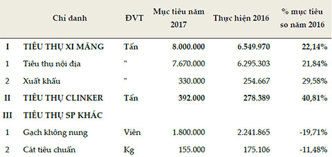 Năm 2017, dự báo nhu cầu tiêu thụ xi măng cả nước ước đạt khoảng 80 triệu tấn, tăng 6% so với năm 2016. Tỷ lệ tiêu thụ nội địa dự báo tăng lên 60 - 65 triệu tấn, trong khi xuất khẩu giảm xuống 14 - 15 triệu tấn.