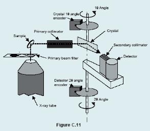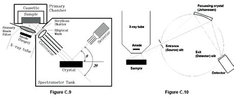 - Thiết bị phổ kế tuần tự (Sequential): Theo truyền thống, phổ kế tuần tự dùng một “Tinh thể phẳng” hoặc “Chùm tia song song” để chọn các góc giữa tinh thể và detector bằng một dụng cụ được gọi là giác kế (Goniometer). Goniometer là một cơ cấu quay, ở đó tinh thể và detector có sự dịch chuyển của từng cặp góc θ và 2θ. Hình dạng của phổ kế với các bộ phận chính như thế được minh hoạ trên hình C.9 và phác hoạ của một Goniometer ARL trên hình C.11.