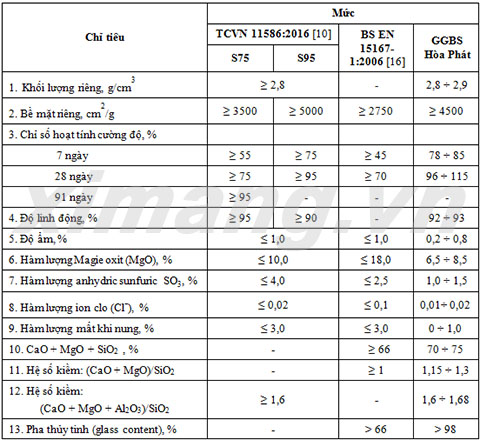 Bảng 2: Một số chỉ tiêu chất lượng của Xỉ hạt lò cao nghiền mịn (GGBS)