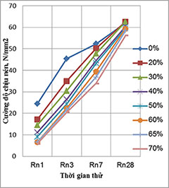 Ở điều kiện nhiệt độ đóng rắn tiêu chuẩn (27oC) cường độ chịu nén của xi măng ở các tuổi sớm 1 và 3 ngày giảm khá nhanh khi tăng tỷ lệ % GGBS trong xi măng, tuy nhiên sau 7 ngày thì cường độ giảm không nhiều và đến 28 ngày thì cường độ nén đã đuổi kịp hoặc thậm chí cao hơn so với xi măng PC50 gốc, mặc dù hàm lượng GGBS thay thế cho xi măng đã tăng đến 50 - 60%. Đây chính là ưu điểm vượt trội của xỉ hạt lò cao nghiền mịn so với các loại phụ gia khoáng khác đang được sử dụng trong xi măng như tro bay, puzolan, bazal, đá vôi, đá đen... Nhờ có đặc điểm này xi măng pha 30 - 60% GGBS sẽ là loại xi măng thích hợp cho bê tông khối lớn cần đóng rắn chậm và tỏa nhiệt thấp.