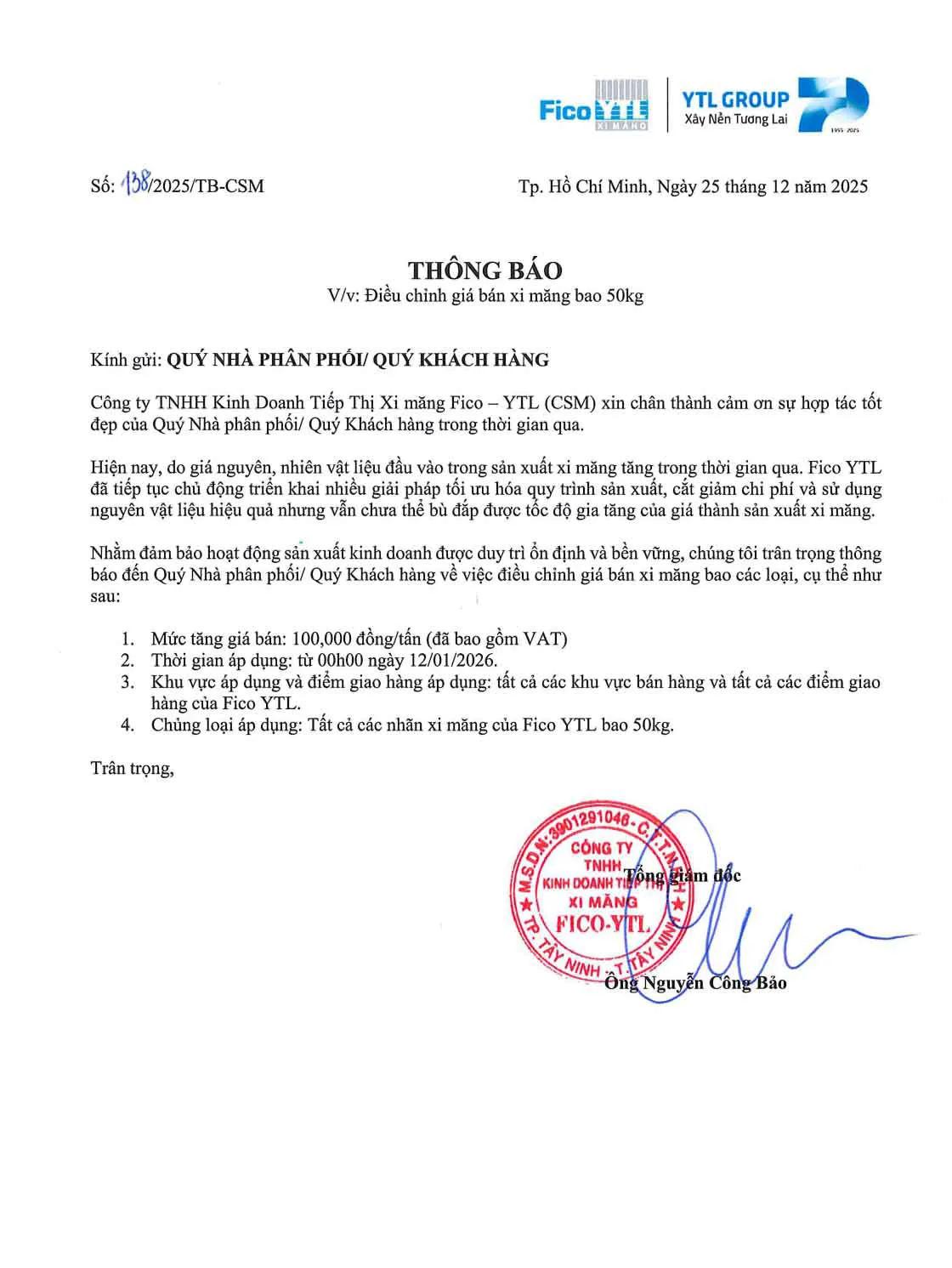 Trong khi đó, Fico YTL cho biết việc điều chỉnh giá là cần thiết nhằm bảo đảm hoạt động sản xuất kinh doanh được duy trì ổn định và bền vững. Doanh nghiệp sẽ tăng giá bán 100.000 đồng/tấn (đã bao gồm VAT), đối với toàn bộ các sản phẩm xi măng bao 50kg. Chính sách này được áp dụng từ ngày 12/01/2026 trên tất cả các khu vực bán hàng và điểm giao hàng của Fico YTL.
