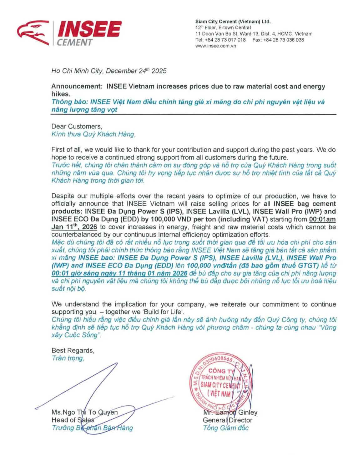 Đối với INSEE Việt Nam, doanh nghiệp xi măng này sẽ điều chỉnh tăng giá bán đối với toàn bộ các sản phẩm xi măng bao gồm INSEE Đa Dụng Power S (IPS), INSEE Lavilla (LVL), INSEE Wall Pro (IWP) và INSEE ECO Đa Dụng (EDD) với mức tăng là 100.000 đồng/tấn (đã bao gồm thuế GTGT), thời điểm áp dụng từ ngày 11/01/2026. Việc điều chỉnh được doanh nghiệp đưa ra sau quá trình cân nhắc các yếu tố chi phí sản xuất phát sinh trong thời gian qua.
