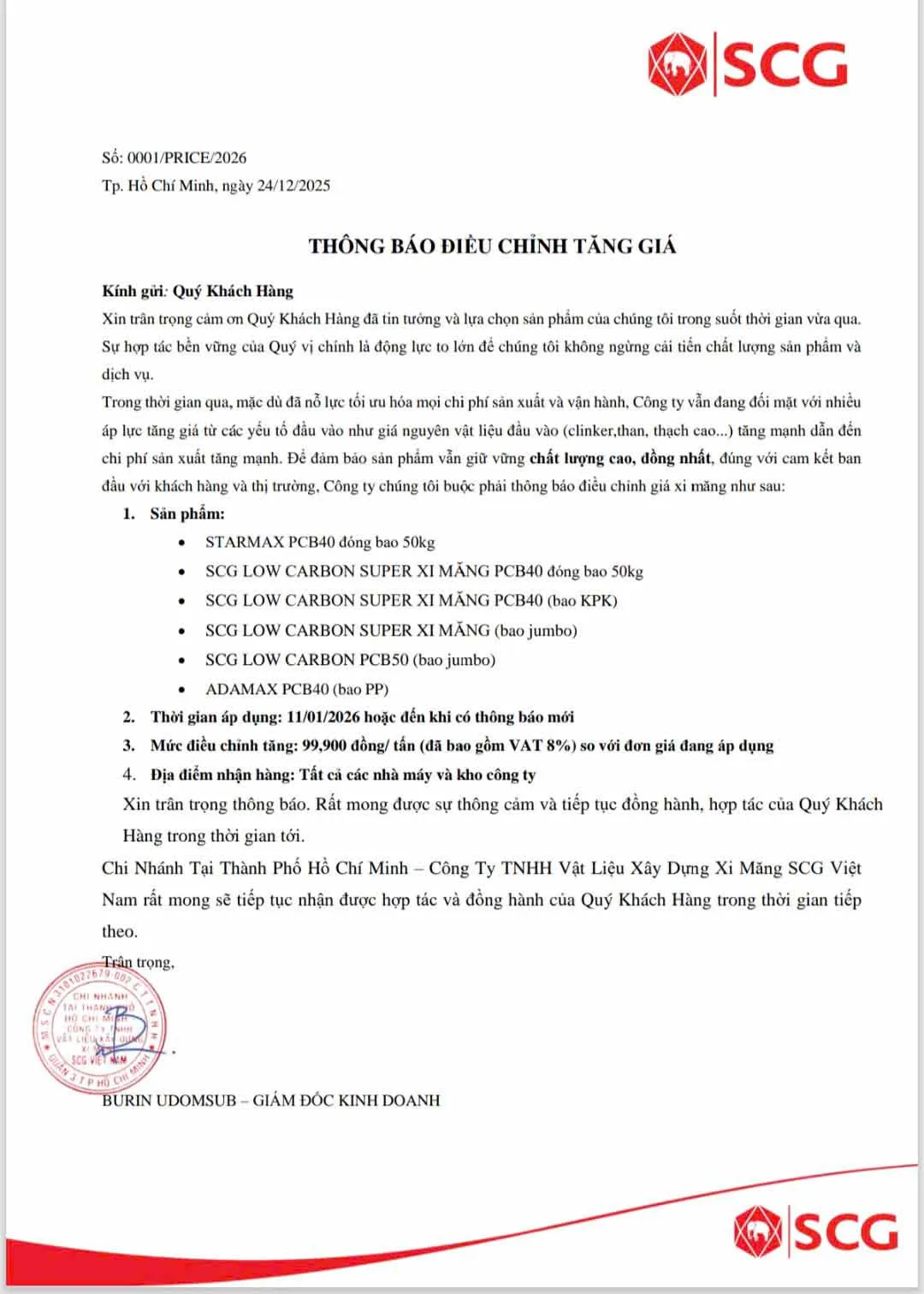 SCG Việt Nam cũng thông báo kế hoạch điều chỉnh giá đối với các dòng sản phẩm xi măng đang tiêu thụ trên thị trường như STARMAX PCB40 bao 50kg; SCG Low Carbon Super xi măng PCB40 (bao 50kg, bao KPK, bao jumbo); SCG Low Carbon PCB50 bao jumbo và ADAMAX PCB40 bao PP. Mức điều chỉnh tăng là 99.900 đồng/tấn (đã bao gồm VAT 8%) so với đơn giá hiện hành. Thời gian áp dụng từ ngày 11/01/2026 hoặc cho đến khi có thông báo mới, nhằm bảo đảm duy trì chất lượng sản phẩm và hoạt động cung ứng ổn định.