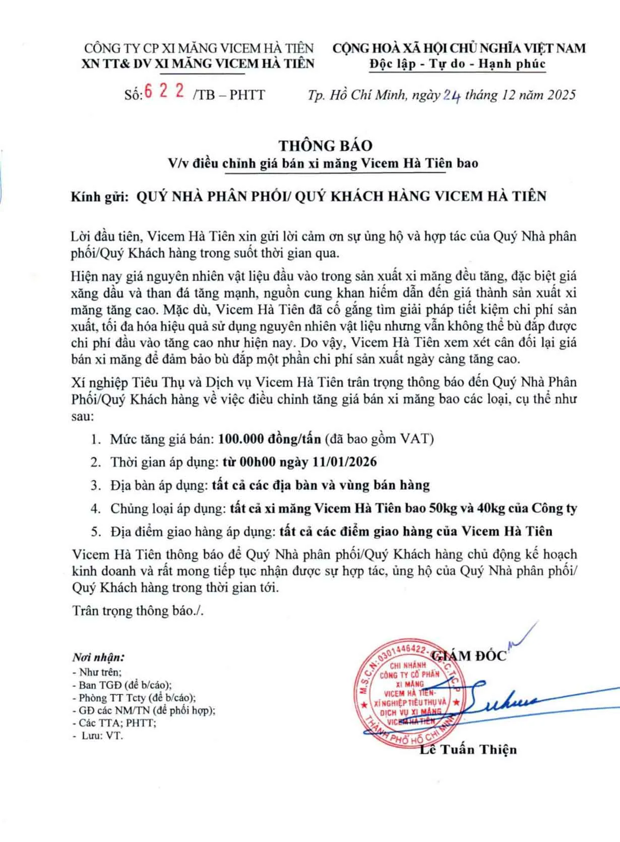 Theo thông báo từ VICEM Hà Tiên, doanh nghiệp cho biết đã xem xét cân đối lại giá bán trong điều kiện chi phí sản xuất gia tăng. Theo đó, Xí nghiệp Tiêu thụ và Dịch vụ VICEM Hà Tiên thông báo điều chỉnh tăng giá bán 100.000 đồng/tấn (đã bao gồm VAT) từ 00 giờ ngày 11/01/2026, đối với tất cả các chủng loại xi măng bao 50kg và 40kg. Thời gian áp dụng, trên phạm vi cả nước.