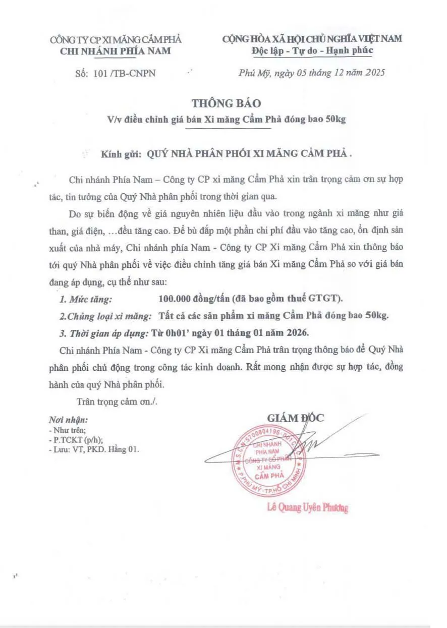 Chi nhánh phía Nam - Công ty CP Xi măng Cẩm Phả cho biết sẽ điều chỉnh tăng giá bán đối với các sản phẩm Xi măng Cẩm Phả đóng bao 50kg từ ngày 01/01/2026, nhằm phù hợp với kế hoạch tiêu thụ và cân đối chi phí sản xuất trong giai đoạn đầu năm. Theo thông báo, mức điều chỉnh tăng là 100.000 đồng/tấn (đã bao gồm thuế GTGT), áp dụng cho toàn bộ các chủng loại xi măng đóng bao 50kg của Xi măng Cẩm Phả.