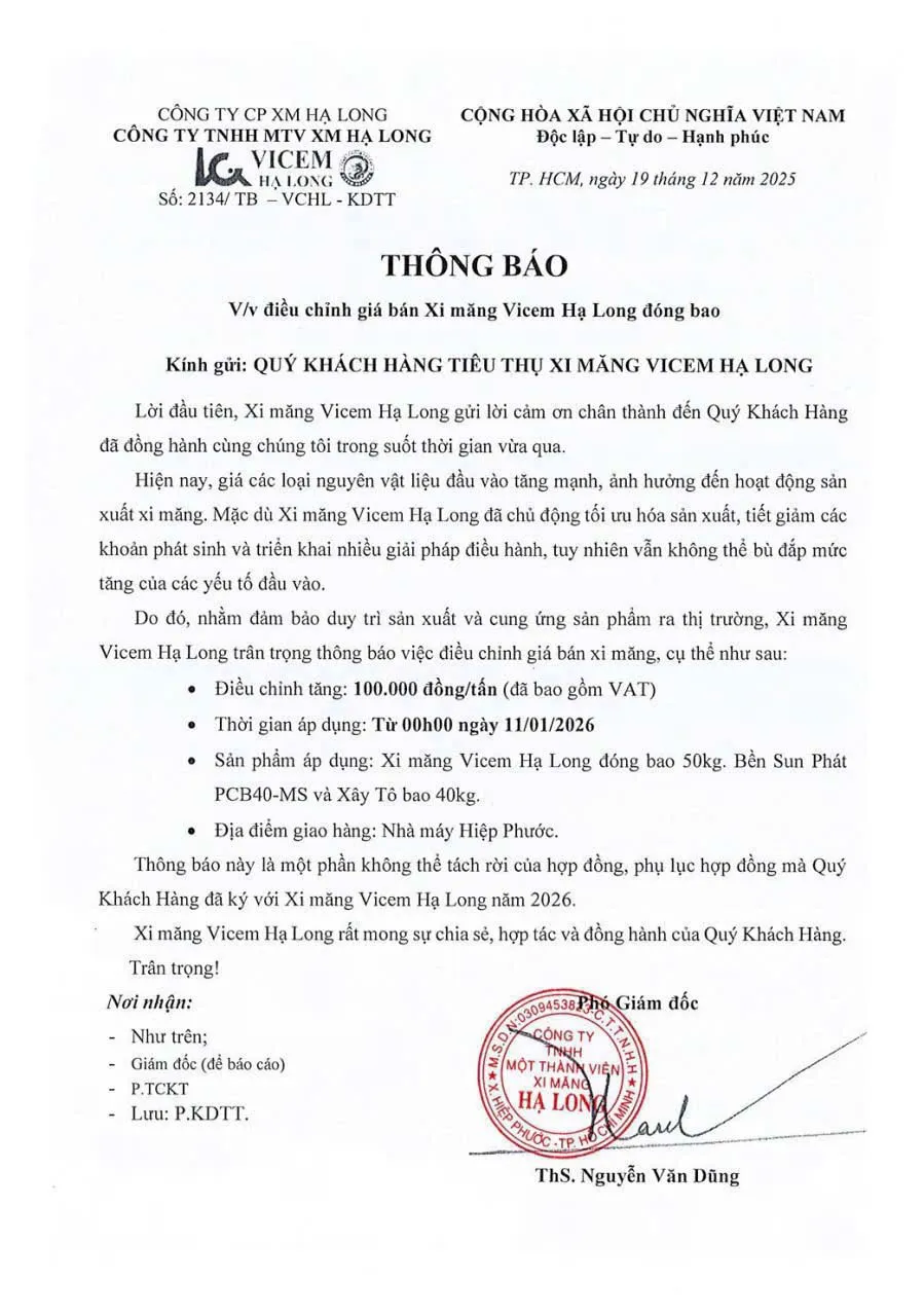 Tương tự, Công ty TNHH MTV Xi măng VICEM Hạ Long cũng thông báo kế hoạch điều chỉnh giá bán xi măng đóng bao tại thị trường phía Nam từ ngày 11/01/2026. Mức tăng được áp dụng là 100.000 đồng/tấn (bao gồm VAT) cho các sản phẩm xi măng: VICEM Hạ Long đóng bao 50kg, Bền Sunfat PCB40-MS và Xây Tô bao 40kg tại nhà máy Hiệp Phước.