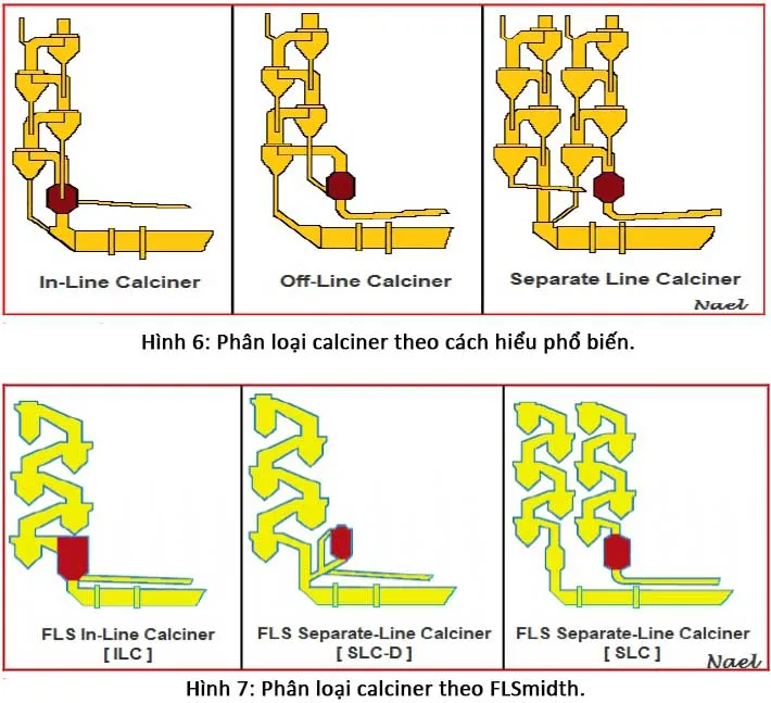 Các khái niệm trên không phải là hệ thống phân loại calciner mang tính tiêu chuẩn, mà chủ yếu là thuật ngữ do từng nhà cung cấp thiết bị sử dụng để mô tả thiết kế của họ. Nếu so sánh 2 cách phân loại trong hình 6 và hình 7, có thể thấy như sau: