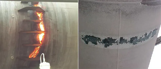 • Điểm đỏ ở khu vực lộ thiên hay có mái che: Nếu vỏ lò bị lộ thiên và gặp mưa lớn đúng vị trí điểm đỏ, sự làm nguội đột ngột có thể gây nứt vỏ lò. Đồng thời, lớp gạch chịu lửa tại khu vực này cũng có thể bị nghiền nát nghiêm trọng.