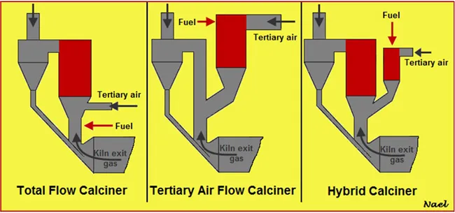 Hệ thống precalciner có rất nhiều dạng nên việc phân loại thường khá phức tạp. Các điểm khác nhau giữa các thiết kế bao gồm: dạng dòng khí xoáy hoặc không xoáy, ống riser kéo dài hoặc buồng đốt riêng, cách cấp gió cháy (qua ống riêng hoặc qua lò quay), số tầng và số nhánh. Tuy vậy, vì quá trình cháy là yếu tố quan trọng nhất trong precalciner nên việc phân loại thường dựa trên cách diễn ra quá trình cháy. Theo nguyên tắc này, precalciner được chia thành 3 loại chính như trong Hình 5: