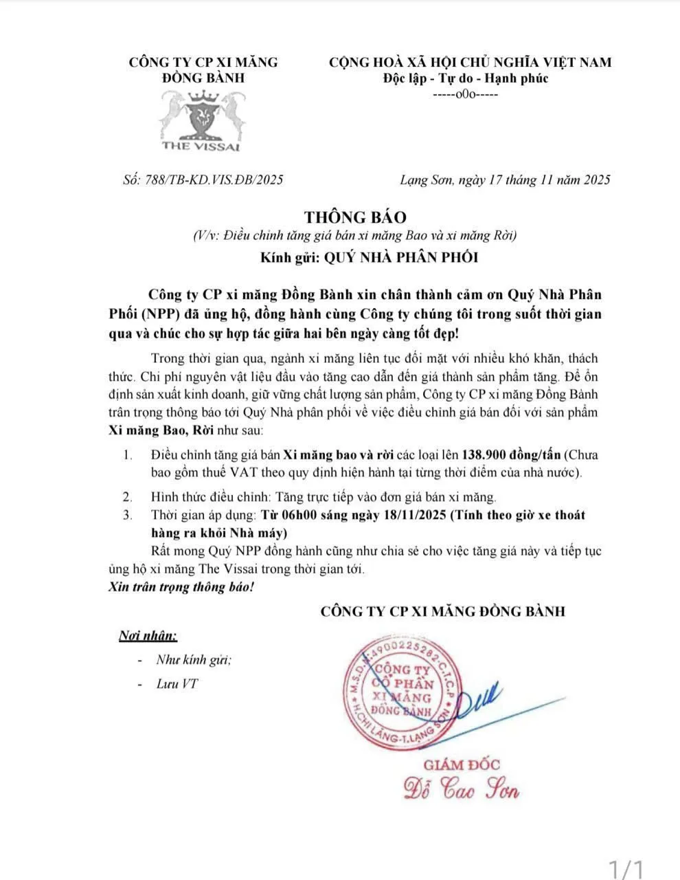 Riêng Công ty CP Xi măng Đồng Bành thuộc Tập đoàn The Vissai đang ghi nhận mức tăng giá bán sản phẩm xi măng bao và rời cao nhất thêm 138.900 đồng/tấn chưa bao gồm thuế VAT 8%. Áp dụng từ 06 giờ sáng ngày 18/11/2025, tính theo thời gian xe xuất hàng khỏi nhà máy.
