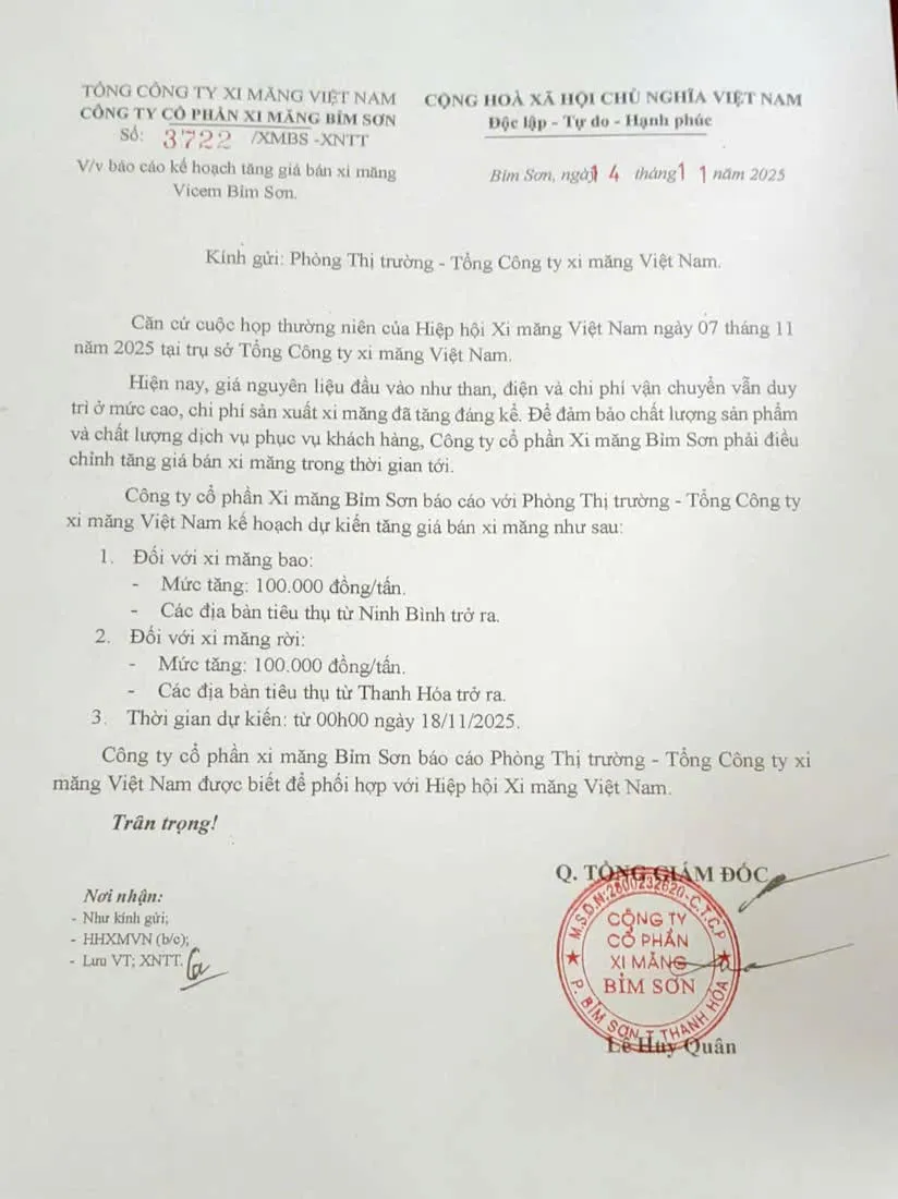 Nhiều nhà máy bắt đầu công bố kế hoạch tăng giá, trong đó Xi măng Bỉm Sơn cho biết chi phí đầu vào như than và điện đã đội lên đáng kể. Doanh nghiệp xi măng này dự kiến tăng 100.000 đồng/tấn đối với cả xi măng bao và xi măng rời. Xi măng bao áp dụng cho thị trường từ Ninh Bình trở ra, còn xi măng rời áp dụng từ Thanh Hóa trở ra. Thời điểm thực hiện từ 00 giờ ngày 18/11/2025.