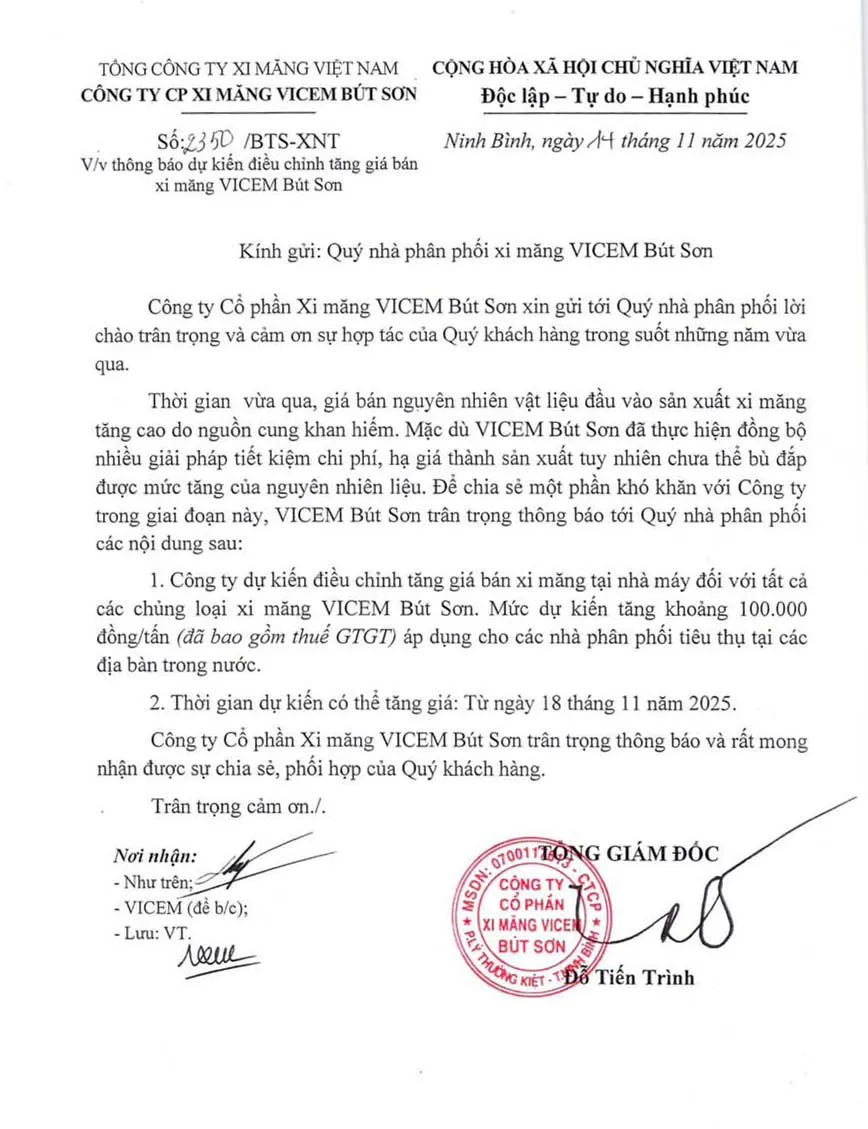 VICEM Bút Sơn cũng ghi nhận giá nguyên nhiên vật liệu đầu vào tăng mạnh trong thời gian dài, dù đã triển khai nhiều giải pháp tiết kiệm nhưng vẫn không bù đắp hết mức đội chi phí. Doanh nghiệp dự kiến điều chỉnh tăng khoảng 100.000 đồng/tấn, đã bao gồm thuế GTGT, cho toàn bộ chủng loại xi măng tiêu thụ tại thị trường trong nước. Thời gian áp dụng từ ngày 18/11/2025.