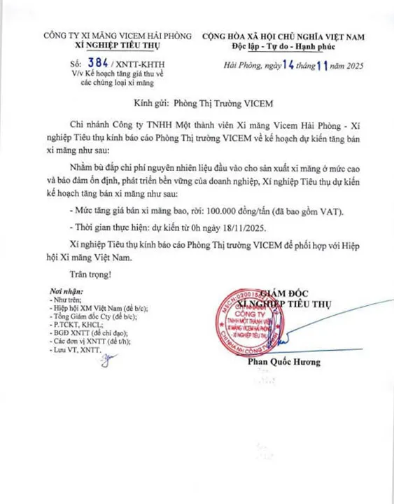 Xi nghiệp Tiêu thụ xi măng VICEM Hải Phòng cho biết chi phí đầu vào tăng cao khiến hoạt động sản xuất chịu nhiều sức ép. Để ổn định sản xuất và hướng tới phát triển bền vững, doanh nghiệp dự kiến tăng giá 100.000 đồng/tấn đối với xi măng bao và rời, mức giá đã bao gồm VAT. Thời gian thực hiện từ ngày 18/11/2025.