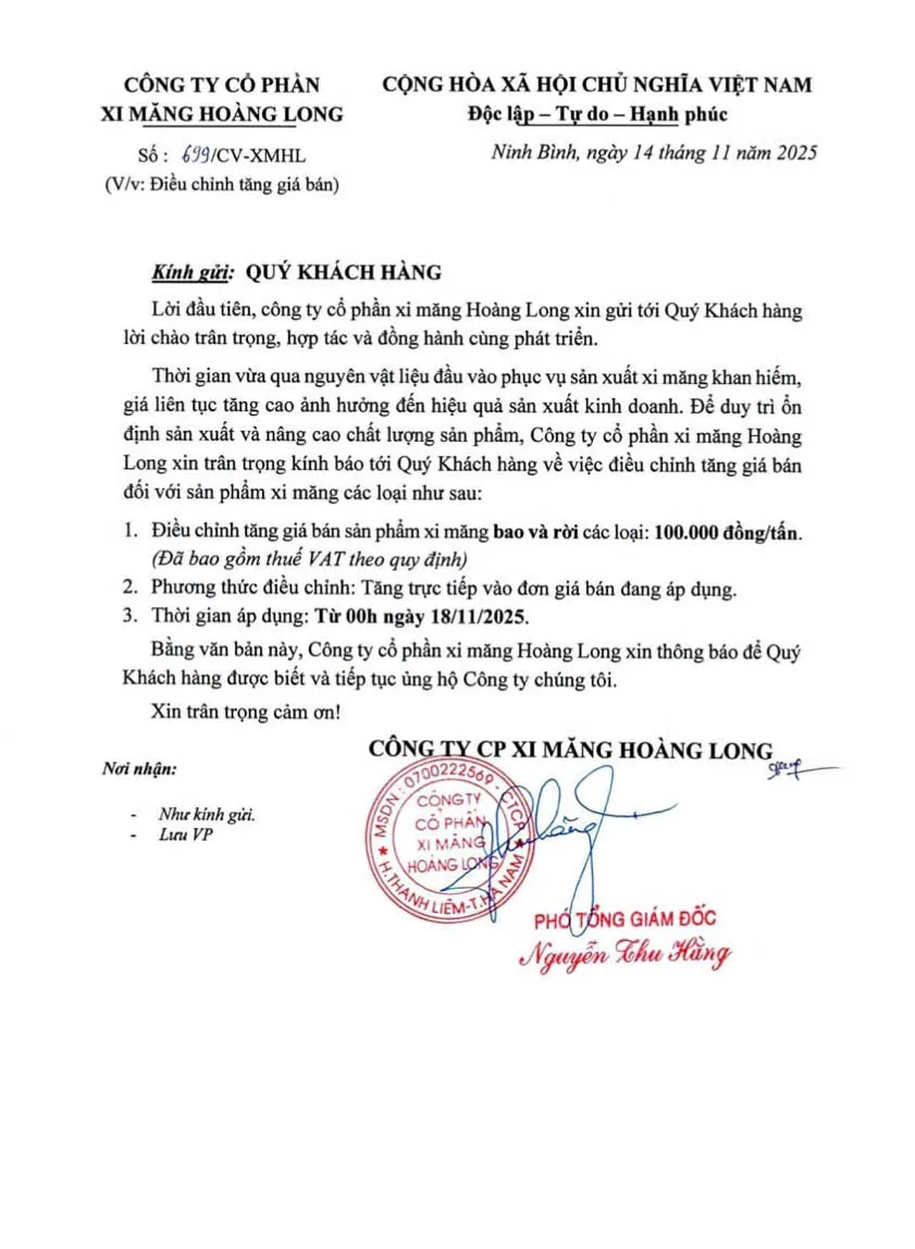 Tại Công ty CP Xi măng Hoàng Long, tình trạng nguyên liệu khan hiếm và giá liên tục tăng đã ảnh hưởng trực tiếp đến hiệu quả kinh doanh. Công ty thông báo điều chỉnh tăng 100.000 đồng/tấn cho cả xi măng bao và xi măng rời, mức giá đã bao gồm VAT và được cộng trực tiếp vào đơn giá hiện hành. Quy định áp dụng từ 00 giờ ngày 18/11/2025.