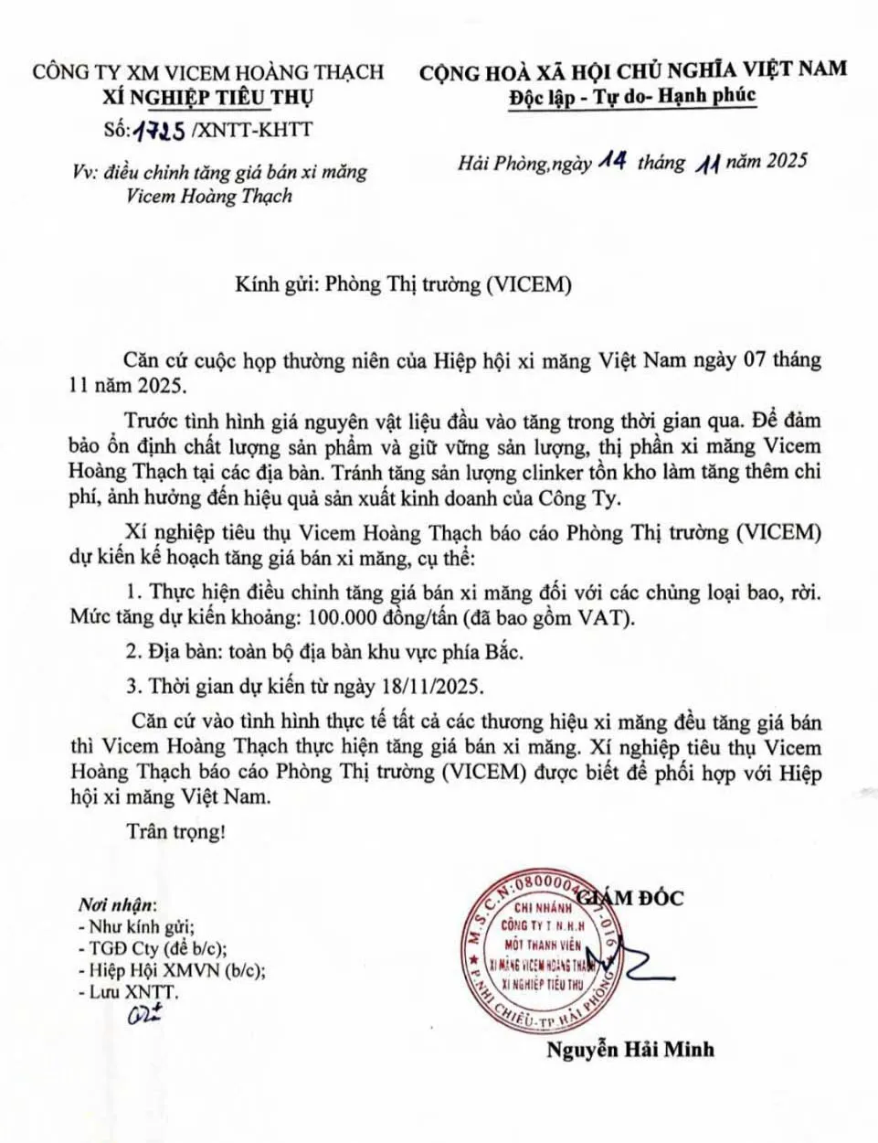 Nhằm giảm bớt áp lực chi phí đầu vào từ giá nguyên vật liệu, than, điện... Xi nghiệp Tiêu thụ VICEM Hoàng Thạch - Công ty Xi măng VICEM Hoàng Thạch cũng thông báo điều chỉnh tăng giá bán đối với sản phẩm xi măng bao và xi măng rời thêm 100.000 đồng/tấn, đã bao gồm VAT. Mức tăng này áp dụng cho toàn bộ khu vực phía Bắc từ ngày 18/11/2025.