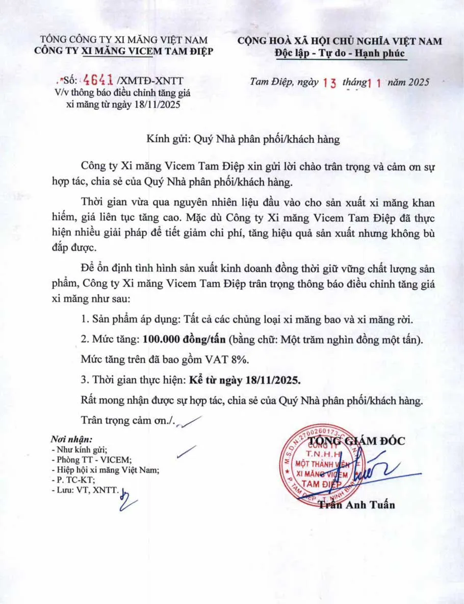 VICEM Tam Điệp cũng phải điều chỉnh để bảo đảm hoạt động và chất lượng sản phẩm khi các loại nhiên liệu đầu vào tiếp tục leo thang. Toàn bộ xi măng bao và xi măng rời sẽ tăng 100.000 đồng/tấn, đã bao gồm VAT 8%, áp dụng từ ngày 18/11/2025.