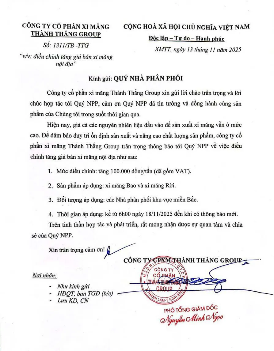 Công ty CP Xi măng Thành Thắng Group cho biết giá nguyên nhiên liệu sản xuất vẫn duy trì ở mức cao. Để giữ ổn định sản xuất và nâng cao chất lượng, doanh nghiệp xi măng này cũng thông báo tăng giá bán thêm 100.000 đồng/tấn đối với xi măng bao và xi măng rời. Chính sách dành cho các nhà phân phối khu vực miền Bắc và có hiệu lực từ 06 giờ ngày 18/11/2025 đến khi có thông báo mới.
