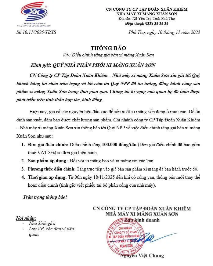 Nhà máy Xi măng Xuân Sơn thuộc Công ty CP Tập Đoàn Xuân Khiêm cũng thông báo kế hoạch tăng giá xi măng trong nước, cụ thể đơn giá điều chỉnh tăng 100.000 đồng/tấn, đã bao gồm VAT 8%, áp dụng cho cả xi măng bao và xi măng rời. Phương thức thực hiện là cộng trực tiếp vào giá đã ban hành trước đó. Thời gian áp dụng từ 00 giờ ngày 18/11/2025, với điều kiện giao hàng được tính theo thời điểm viết phiếu tại bộ phận cân của nhà máy.