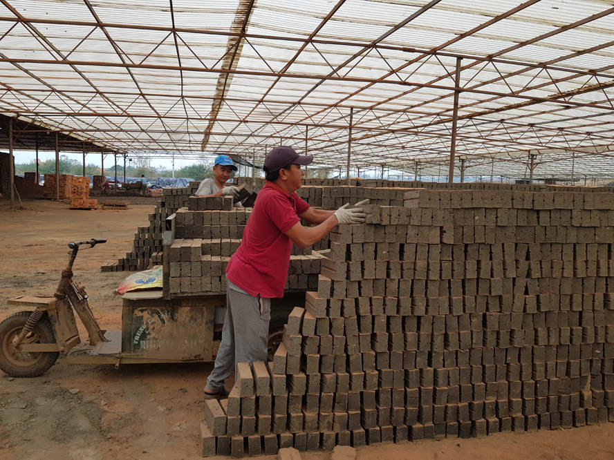 Công nhân đang chuyển gạch mộc vào một lò đốt tại xã Bắc Phú.