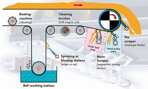 Trên Thế giới hiện nay, có thể kê ra một số phương pháp làm sạch băng tải như rửa băng tải, phun hoặc thổi băng tải bằng nước hoặc dầu, con lăn xoắn, thiết bị rung băng, trục chổi, gạt sạch băng bằng phương pháp cào...