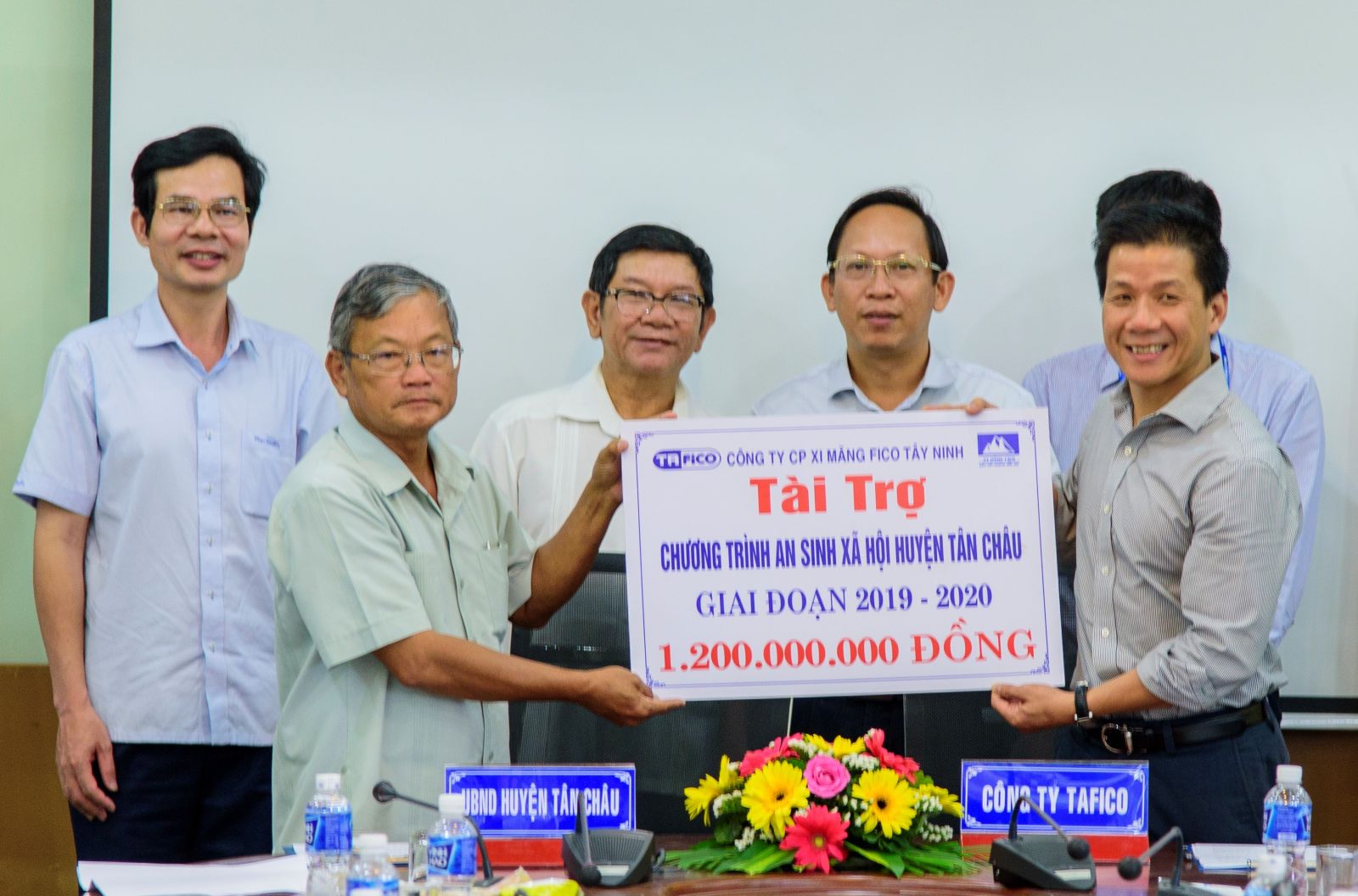 Công ty Cổ phần Xi măng FiCO trao biển tượng trưng số tiền hỗ trợ chương trình an sinh xã hội cho huyện Tân Châu giai đoạn 2019 - 2020.