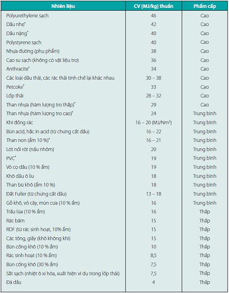 Bảng 2 cho thấy nhiệt trị của các nhiên liệu thay thế so với một số nhiên liệu truyền thống. Nhiệt trị không chỉ thị trực tiếp giá trị về mặt giá cả. Ví dụ các lốp thải tốt như than trên quan điểm CV (nhiệt trị) nhưng không được trả giá như than do nó khó xử lý hơn (trên thực tế giá bằng 0 thậm chí còn thu được phí thải bỏ).