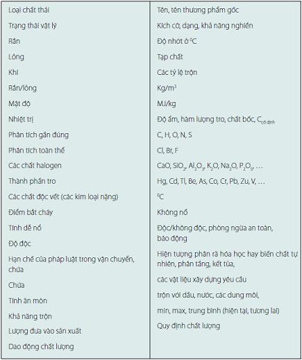 c. Danh sách kiểm tra đối với các tính chất của các nhiên liệu thải