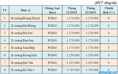 Giá bán lẻ trên thị trường: Theo báo cáo của Sở Tài chính các tỉnh, thành phố, giá bán lẻ xi măng tháng 12/2015 vẫn giữ ổn định so với tháng 11/2015. Hiện tại giá bán tại các tỉnh miền Bắc, miền Trung phổ biến từ 1.050.000 - 1.550.000 đồng/tấn; tại các tỉnh miền Nam phổ biến từ 1.460.000 - 1.850.000 đồng/tấn.