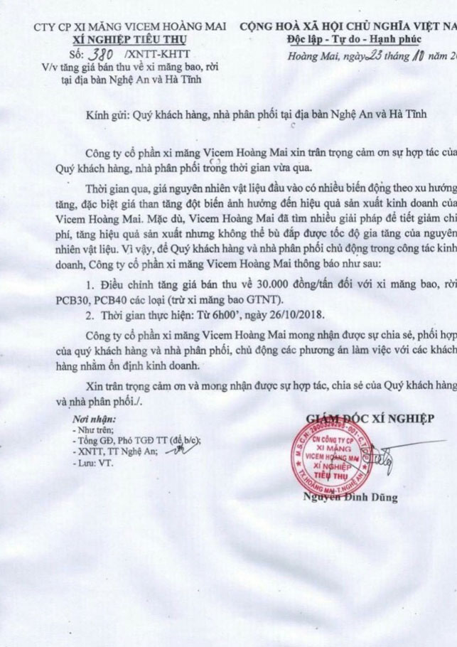 Do giá nguyên vật liệu đầu vào tăng, đặc biệt giá than tăng đột biến ảnh hưởng đến hiệu quả sản xuất kinh doanh của Vicem Hoàng Mai. Từ ngày 26/10/2018, Công ty CP Xi măng Vicem Hoàng Mai sẽ điều chỉnh tăng giá bán xi măng bao, rời PCB30, PCB40 (trừ xi măng bao GTNT) tăng 30.000 đồng/tấn trên địa bàn Nghệ An và Hà Tĩnh.