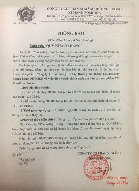 Xi măng Hướng Dương dự kiến tăng giá bán sản phẩm Xi măng Pomihoa